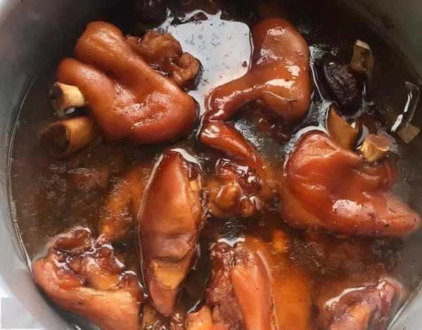 3、放完气以后,打开看一看,颜色味道都非常棒,热吃软烂,凉吃筋道,头香和尾香连接,口感更顺畅,越吃越香,浸泡一晚更入味,吃完猪蹄的老汤,还可以重复利用,放点鸭货、鸡胗、鸡腿、猪头肉、鸡蛋、五花肉啥的,都非常的好吃。