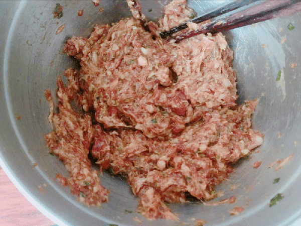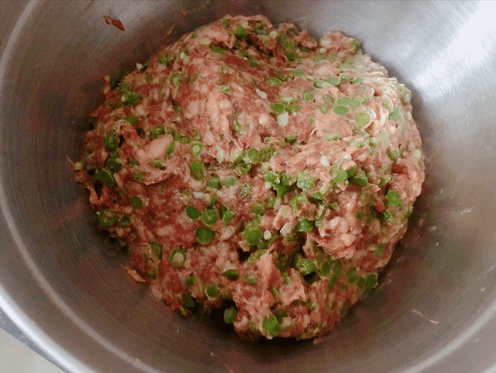 4、等葱姜水,全部被肉馅吸收以后,再把切好豆角,全部倒在肉馅中,搅拌均匀,肉馅部分就制作完成了。