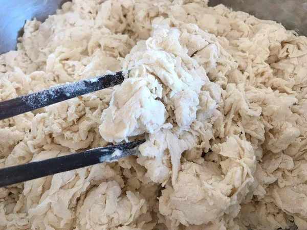 7、边倒水边搅动,一直搅出面絮的样子,如图所示,接着下手揉面就行了,就像平时那样,揉成软硬适中的面团,由于每一款面粉的吸水性不同,水分上下浮动10克问题不大。