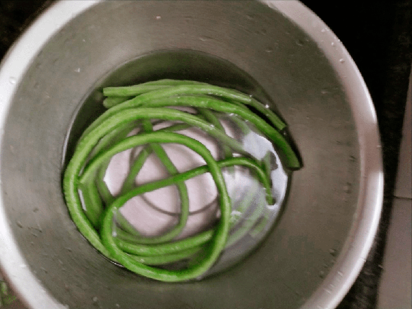 1、准备100克豇豆角,可以自己种植,也可以购买新鲜的豆角,越新鲜越好,老了得不好吃,第一步先择洗干净,看看有没有虫子眼,起锅烧水,焯水3-5分钟,过一遍凉水。