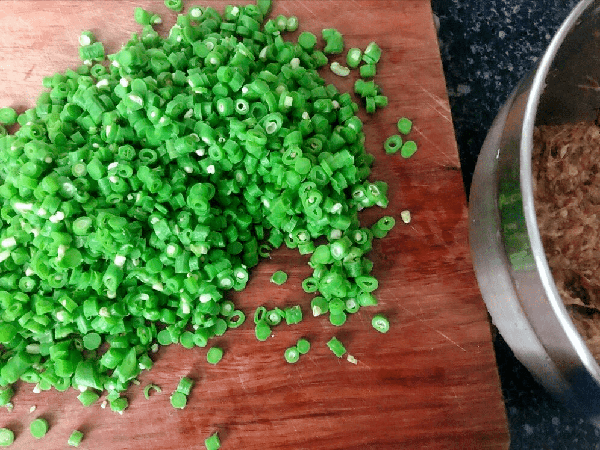 2、豆角控干水分之后,改刀切成碎末,间隔0.5厘米即可,焯水后的豆角,会去掉一部分水分,另外颜色也更漂亮。