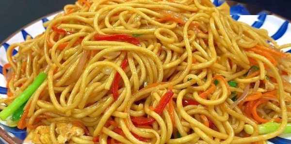 4、油热后把鸡蛋液倒入锅中,煎至两面金黄后,改刀切成细丝备用。油热后把配菜倒入炒至断生。再把面条放进来,开大一点的火来炒出锅气,倒入料汁,继续开大火翻炒,把鸡蛋丝,小葱段一起放进来,把小葱炒至断生后就可以关火出锅了。