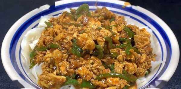 3、锅中油热后,把鸡蛋液倒入锅中炒散,炒好后先盛出来。放入葱花和蒜末炒出香味,把青椒丝翻炒几下,倒入料汁开大火把汤汁熬至浓稠一点,再把鸡蛋放进来,翻炒均匀,汤汁变得粘稠后,就可以关火出锅了。青椒鸡蛋酱拌面真的太香了。