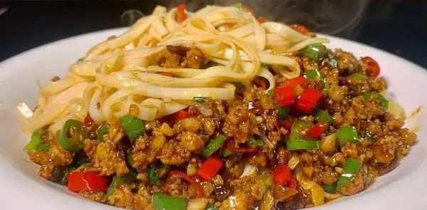 3、油热之后,把肉末炒至变色,再把姜蒜加进来炒出香味。再加入一勺豆瓣酱炒出酱香味。再把青红椒炒至断生。再把料汁加进来翻炒均匀,最后再把葱花加进来,翻炒几下就可以啦。把肉末全部淋到面条上,肉末拌面香味十足,好吃又解馋。