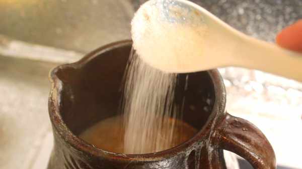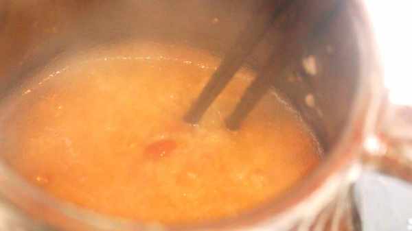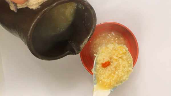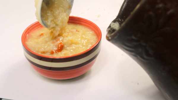 纹火熬制半个小时候以后,罐子里的粥就成了上图中的粘稠状,已经完全熬制好了,看上去非常诱人,而且远远的就能闻到香味。