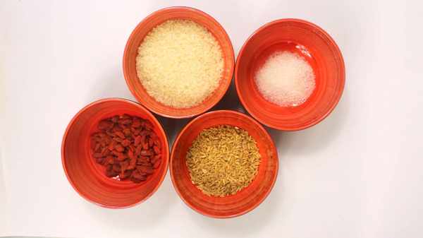 首先备好燕麦30克、大米100克、枸杞子10克、白糖3克。