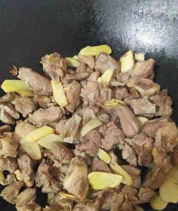 3、锅加热倒入少许油,先放姜炒一会,然后再倒入焯好水的羊肉,炒5分钟,盛到高压锅中;