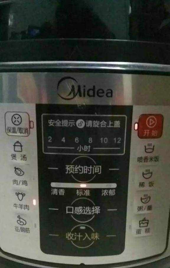 6、高压锅盖上盖子,插上电按牛羊肉按键,开始运作,大约50分钟左右,跳到保温,这时候先不要着急拔插头,等过5分钟后再拔;