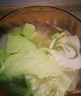 4.将洋白菜放入锅中,汆水。放入葱姜、鸡精、盐调味。