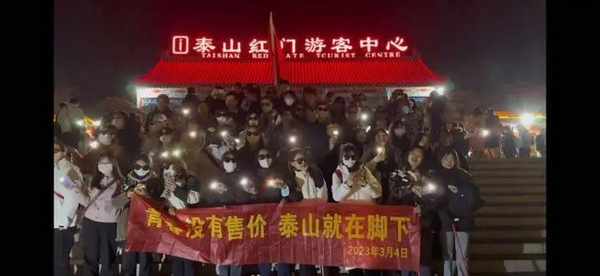 而作为全国第一个“世界文化与自然双重遗产”“第一批国家级风景名胜区”的泰山依旧热度不减。早在3月1日,泰山景区就已发布公告,表示3日(周五)4日(周六)的夜间时段“0元门票”预约量已满。周末两天,众多网友在各大社交媒体晒出“泰山日出”。组团来爬泰山的大学生在红门拉开横幅,合唱“后来”,“青春没有售价,泰山就在脚下”。