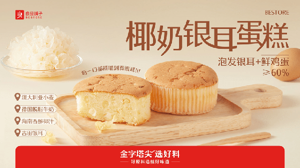 椰奶银耳蛋糕是良品铺子今年春季主打的一款新品,良品铺子精选澳大利亚的小麦、德国的脱脂牛奶,将古田银耳融入到蛋糕中,搭配上海南椰汁的清香,配料上泡发银耳与鸡蛋的含量≥60%,让消费者“每一口都能嚼到真银耳”。