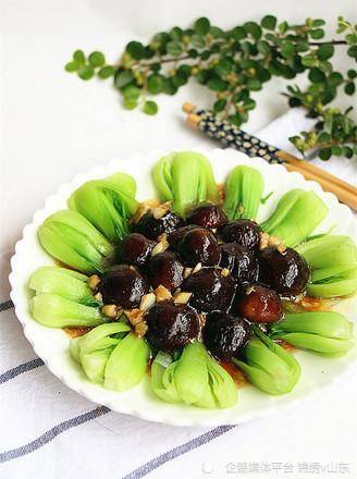 3、油锅炝葱酸辣,加耗油,倒入调料水烧热,然后倒在摆好盘的香菇青菜上几棵。