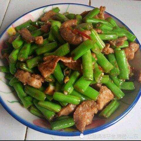 4、热锅放油,爆香葱姜蒜末,干红辣椒丝,放入切好的肉片翻炒熟,再放入豆角丝,翻炒均匀。
