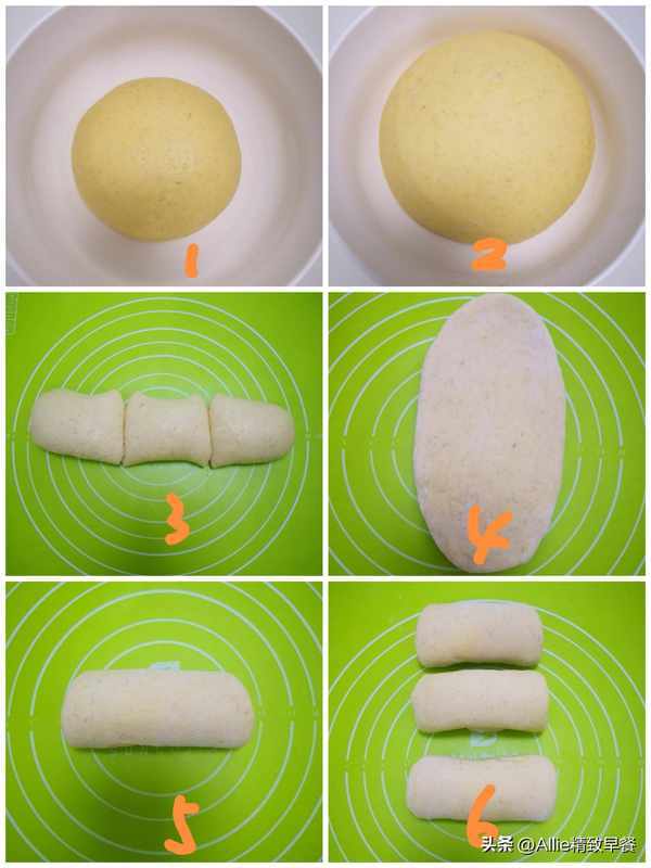 2.冷藏发酵至两倍大。 3.取出发酵好的面团,压出空气,分成三等份。 4.揉成圆形后盖上保鲜膜静置10-15分钟,取出面团擀成椭圆形,椭圆的宽度要小于面团的宽度。一个小盒子。 5.从上往下卷,底部要薄一点,这样不容易松。 6.准备剩下的绿卷。