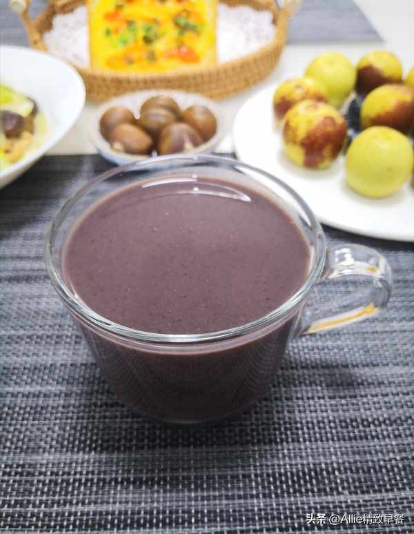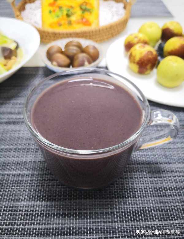 将所有材料倒入豆浆机,加入适量清水,选择麦片豆浆机功能键。