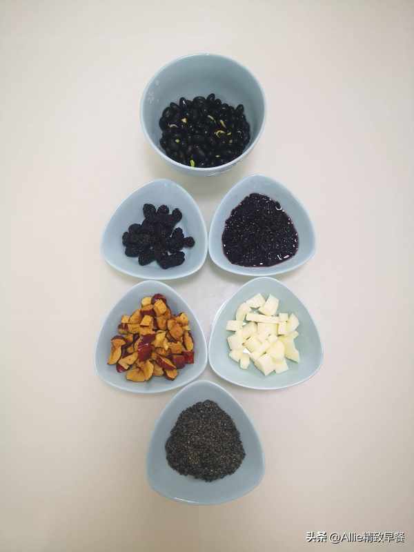准备泡发好的黑豆、桑葚、黑米、红枣去籽切小块,山药去皮切小块,黑芝麻备用。