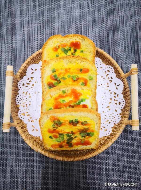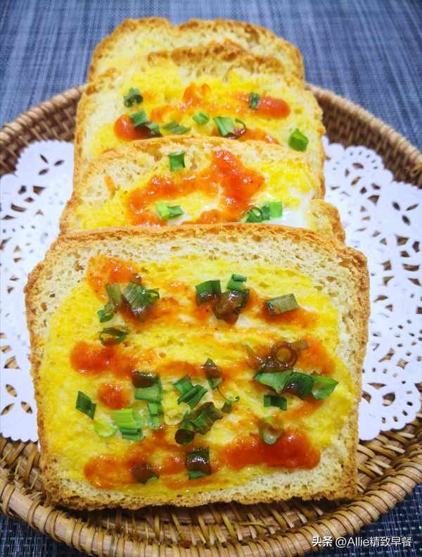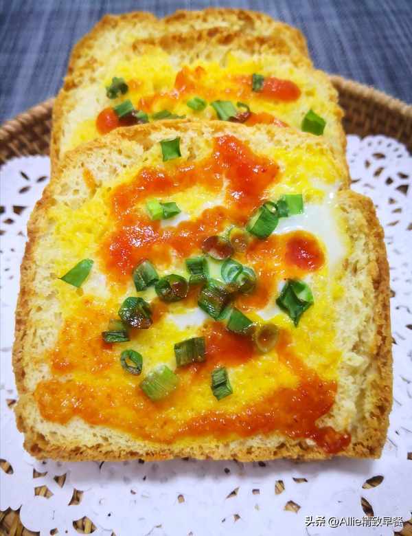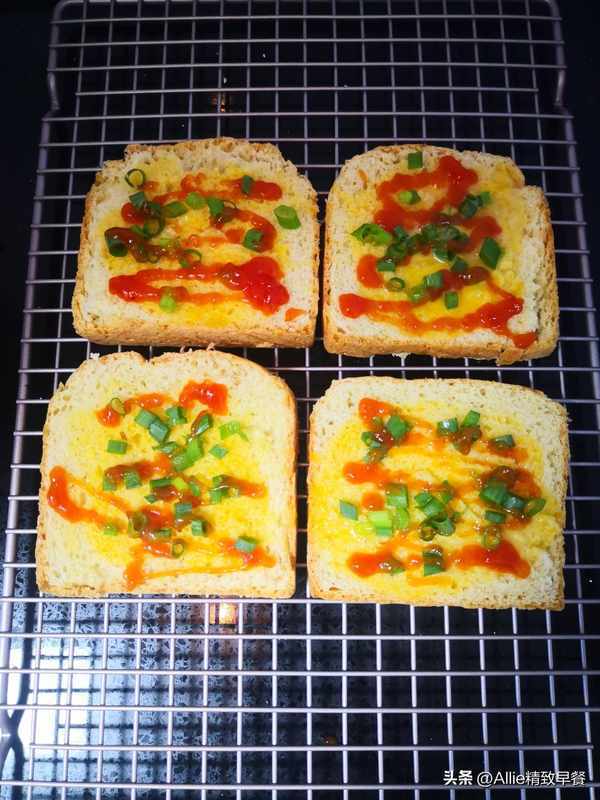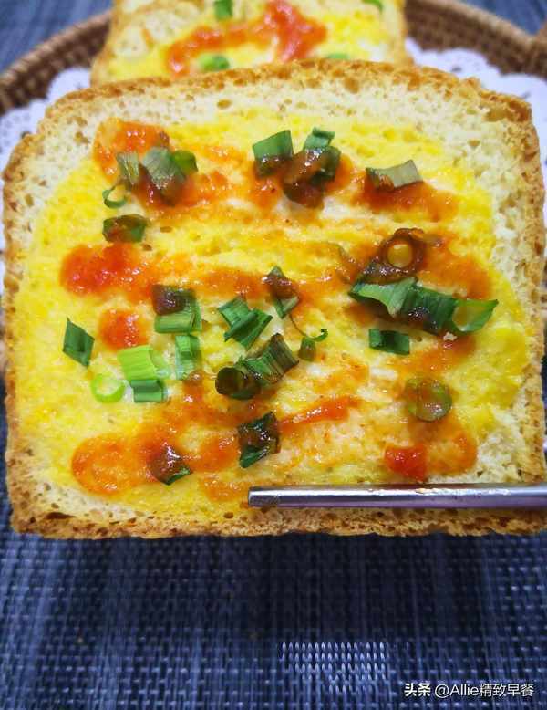 在一片吐司上抹一层鸡蛋,撒上葱花提香,撒上自制的番茄酱,番茄酱的做法可以参考