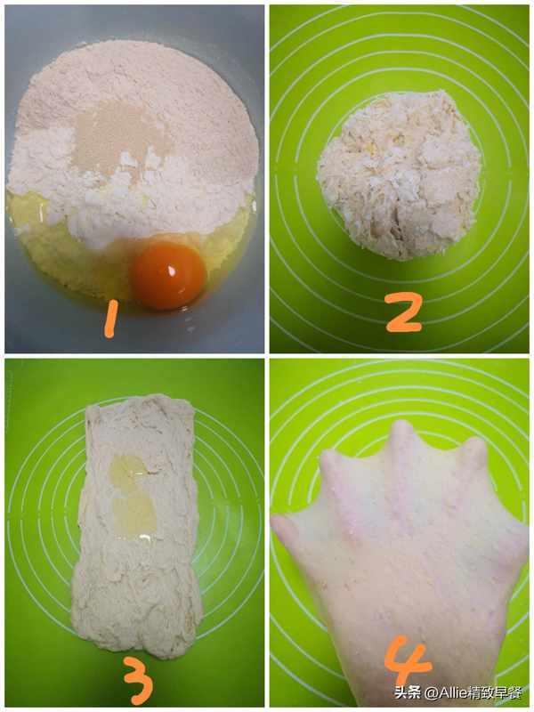 面团:高筋面粉、纯麦片、鸡蛋、酵母、牛奶、食用油浇头:葱花、鸡蛋、自制番茄酱【实践】 1、将高筋面粉和普通燕麦放入碗中,比例4:1,打一个鸡蛋,加入适量的酵母,酵母为两种面粉总质量的1%,拌匀后加入少量多次。加入牛奶,用手揉成柔软的面团。 2.将面团转移到案板上。 3.像擦衣服一样擦掉金刚砂膜,然后加入玉米油或融化的黄油。 4.擦至表面油完全混合后,再继续擦整个手套膜。