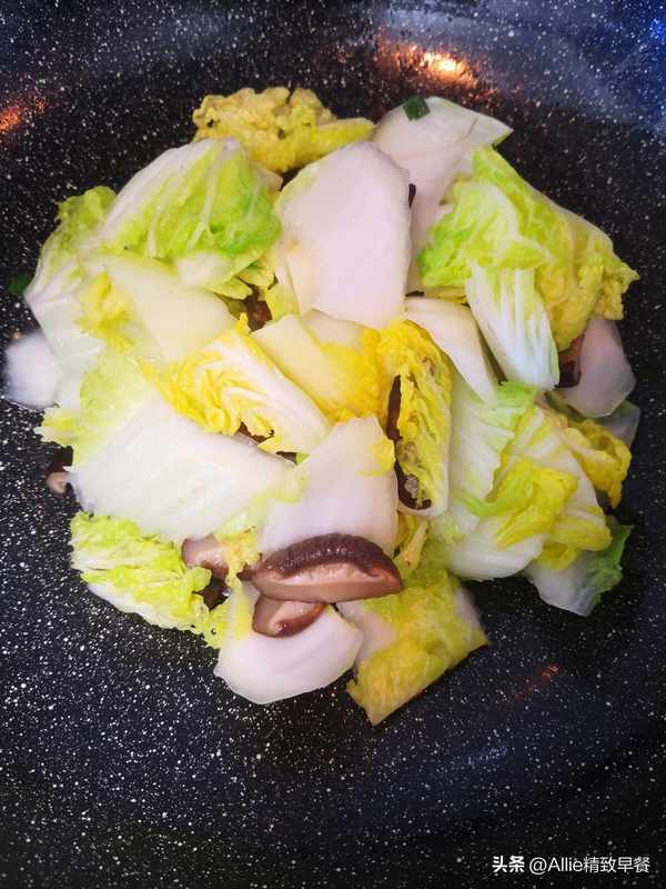 加少许油,加入葱花爆香,倒入泡软焯水的小白菜和香菇。