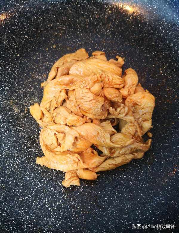 鸡胸肉切成薄片,加盐、生抽、老抽少许、藕粉或姜黄粉、食用油几滴,分次搅拌至浓稠,腌制20分钟。锅里放油烧热,加入腌制好的鸡胸肉,炒至肉变色,备用。