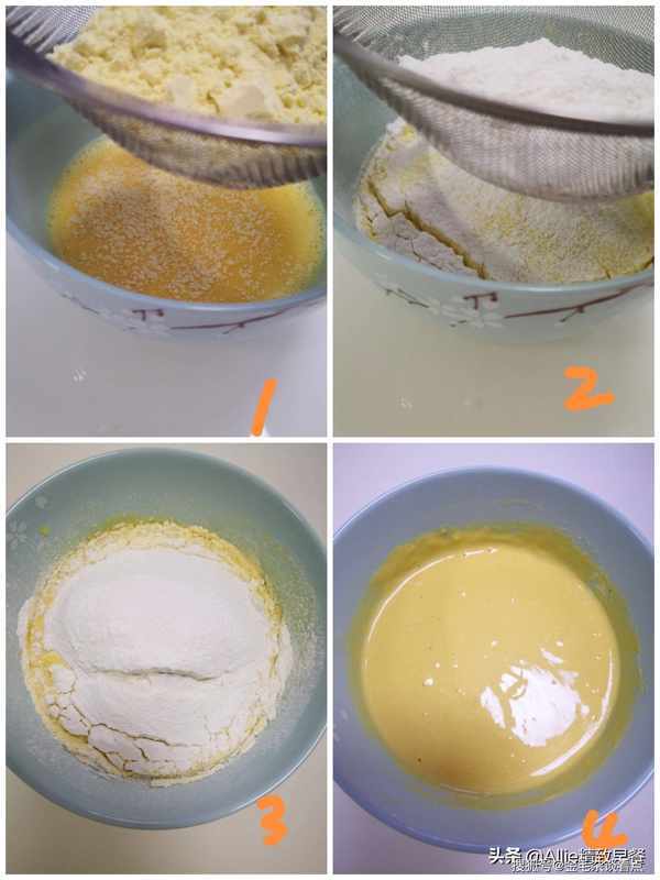 3.过筛可以防止面粉松散,如果是紧实的,容易混合。 4.搅拌至稀面糊细腻无干粉,这个阶段面糊的状态一定要是可以流动的稀面糊,放一边待用。