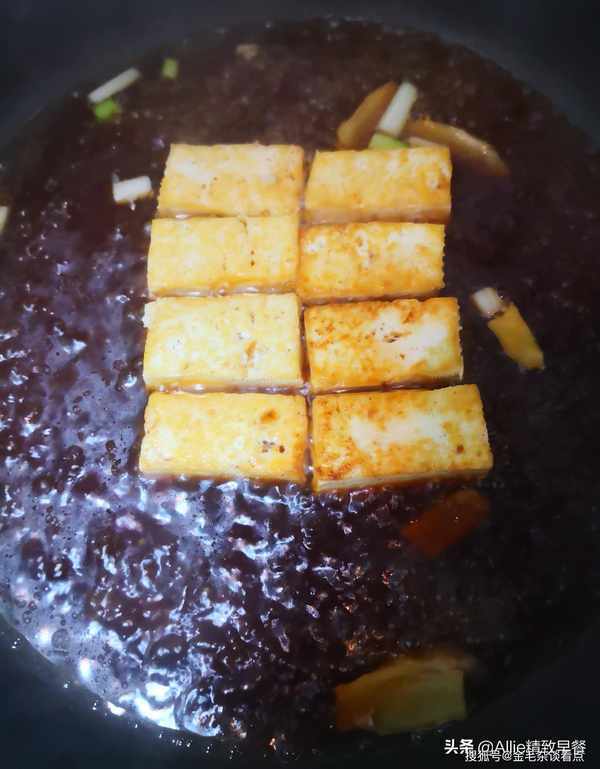 把酱汁倒在豆腐上。