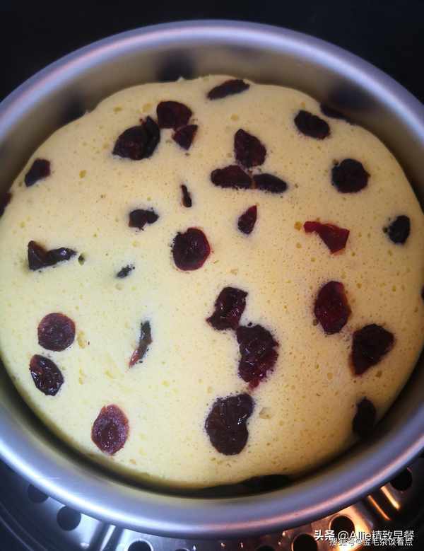 2、撒上适量的蔓越莓干。 3、盖上耐高温保鲜膜,防止水汽滴到小米糕上,影响爬坡和坠落。