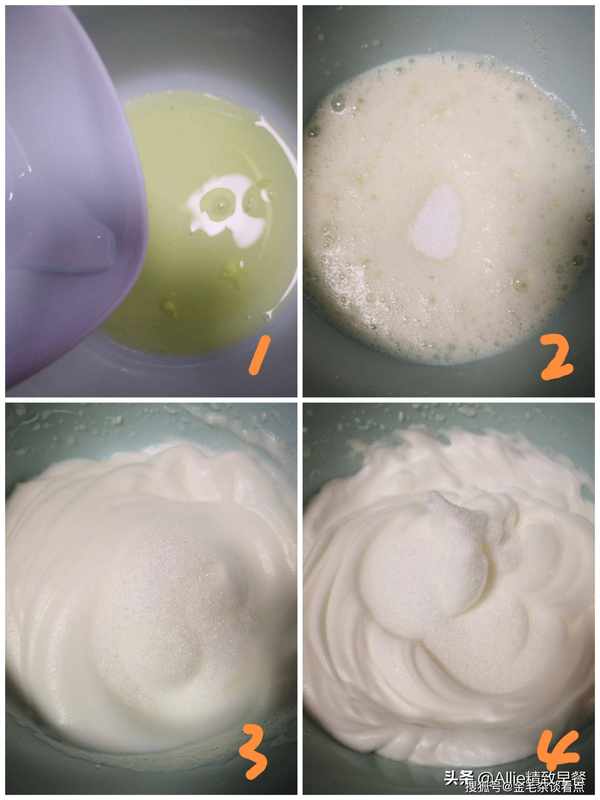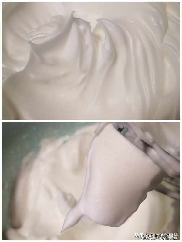 最后用低速打至蛋白霜变硬,蛋白霜的硬度可以突然一下,提起打蛋器后不会变形。
