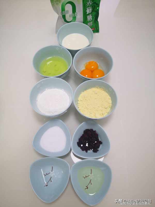 分别称取配料,以下配料从上到下依次为:牛奶、蛋清、蛋黄、糯米粉、小米粉、零卡糖、蔓越莓干、白醋、油角以下容器必须先无水无油才能用来盛放食材。