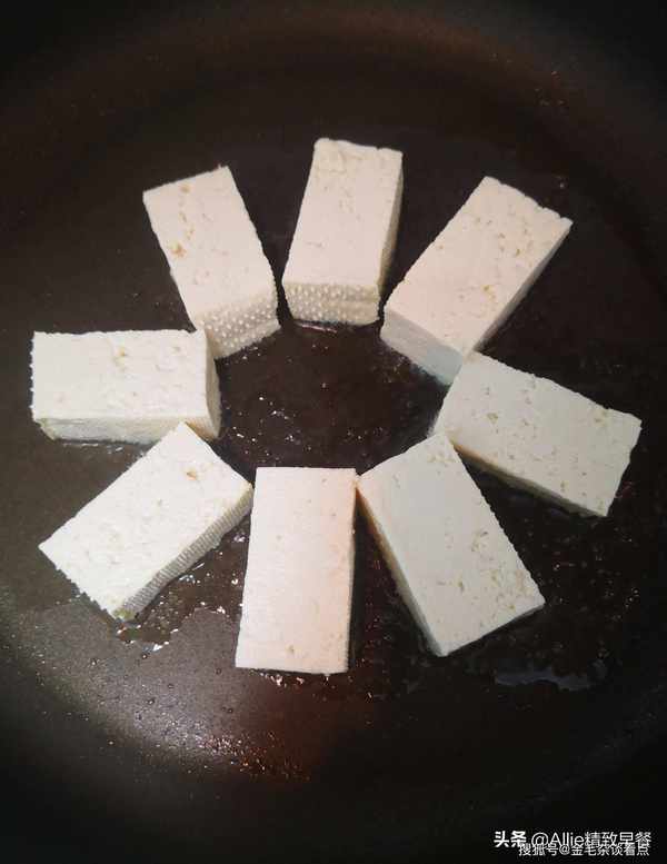 豆腐、红辣椒、韭菜。【实践】老豆腐切成长方形,平底锅刷上薄油,炸至豆腐的一面金黄。