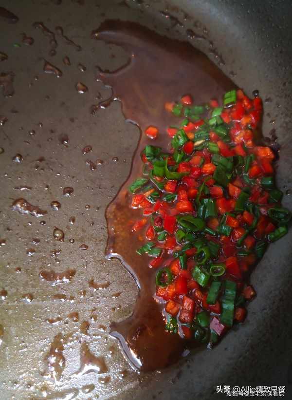 在剩下的豆腐汤中加入红辣椒片和葱圈,用小火煮约1分钟,勾芡即可盛出。