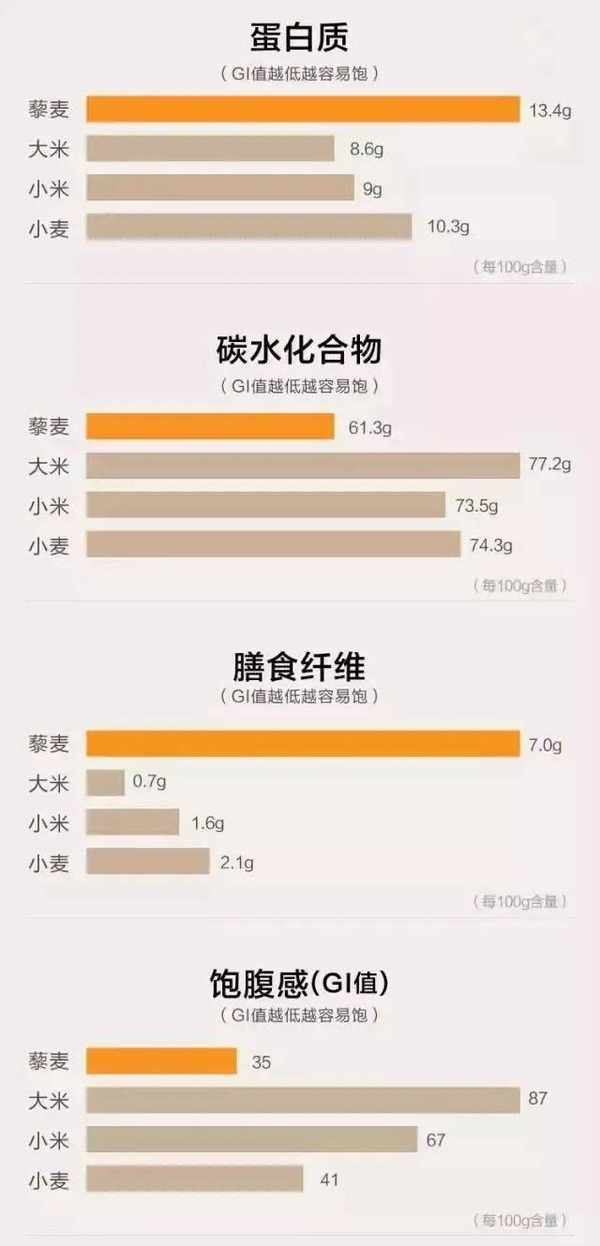饱腹感的原因是藜麦的低GI值,简单来说,记住GI值越低的食物消化得越慢,越不会导致血糖的过快升高造成脂肪堆积。