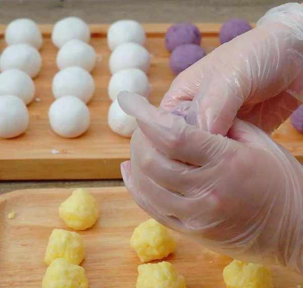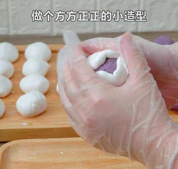 最后用糯米皮把芋泥包住,做个方方正正的小造型。