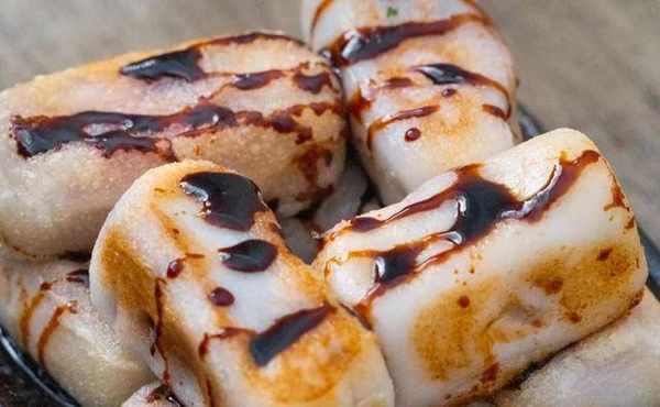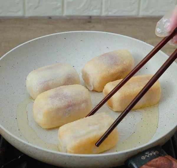 锅里放点油,用小火慢慢的把年糕每一个面都煎到焦黄就可以出锅啦!