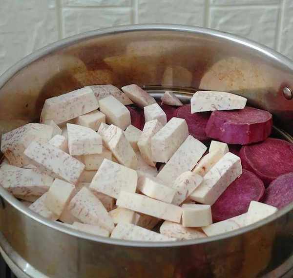紫薯、芋头、糯米粉、糖马苏里拉芝士、牛奶、红糖水