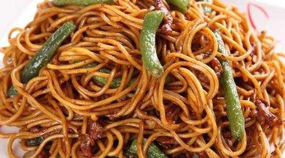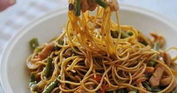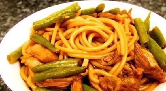 第三步,另起一个锅,烧一锅开水,准备煮面条。在锅里放一点盐,一点油。水烧开之后,放入面条。面条下锅之后,煮两分钟,面条就可以捞起来了。然后沥干水分,备用。等到有肉丝的锅煮到五分钟之后,放进面条炖煮。让面条充分地吸收扁豆和肉的汤汁。改成小火焖制十分钟.