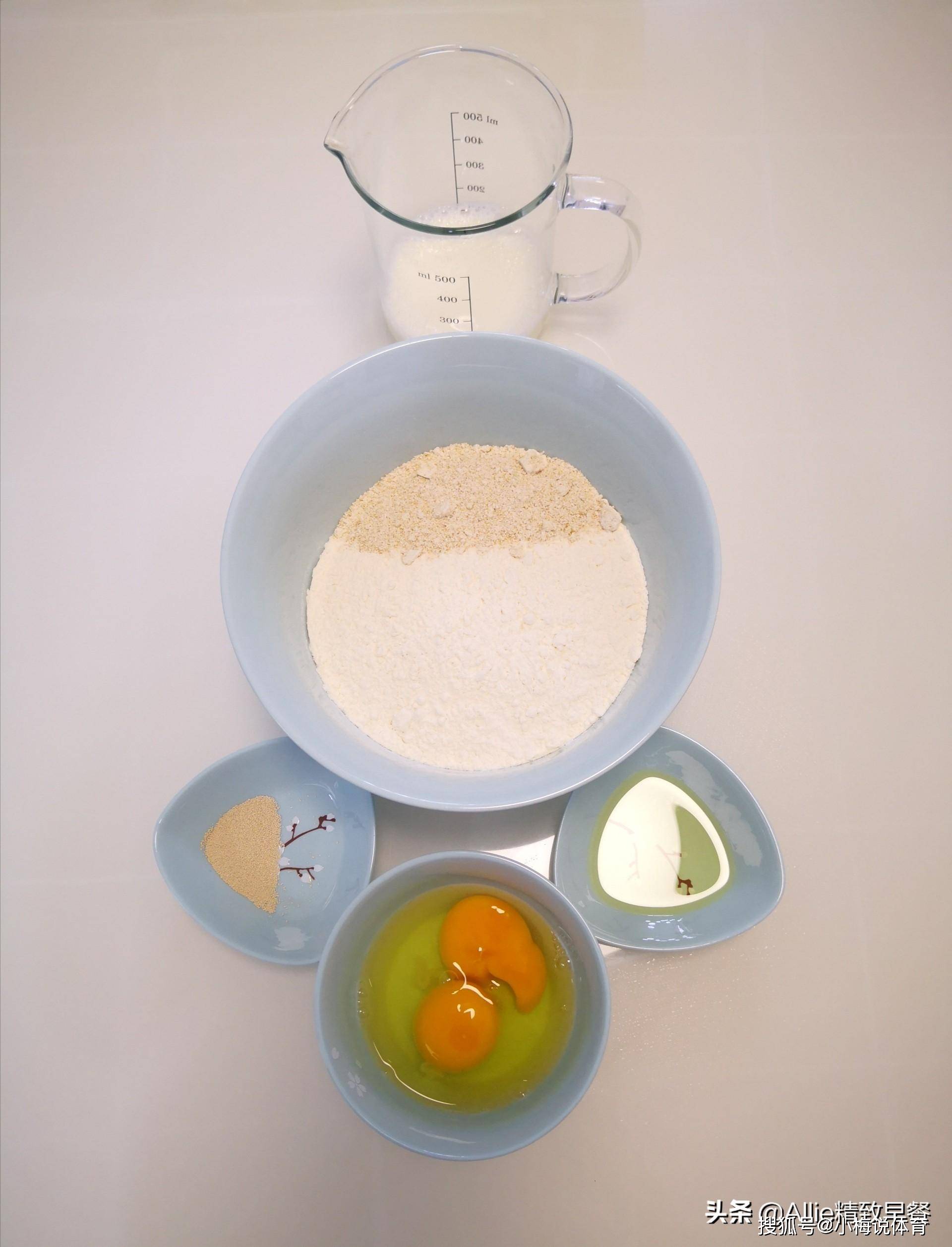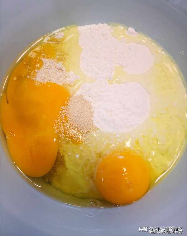 准备一些牛奶,牛奶也可以换成温水,酵母3克,鸡蛋2个,玉米油10克,网上教程用的面粉30克,糖30克,我把油的量减到10克,玉米油也可以用黄油代替。制作面包油很重要。添加或多或少以防止烘焙产品变干和变硬。多加点油,不仅能揉出手套膜,还能使质地更丰富、更柔软。,但是油的热度太高,我减了三分之一,个人觉得成品吃起来比较软,如果对口感比较讲究的可以适当增加油量,我做的不加糖,但是加糖可以保湿锁水,二是增香增甜,三是糖高温后容易焦化,上色效果更好。如果您注意到这一点,请相应地添加。我自己也不喜欢。糖的热量不低。不利于保持体形或试图减掉脂肪。