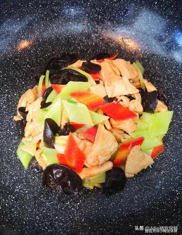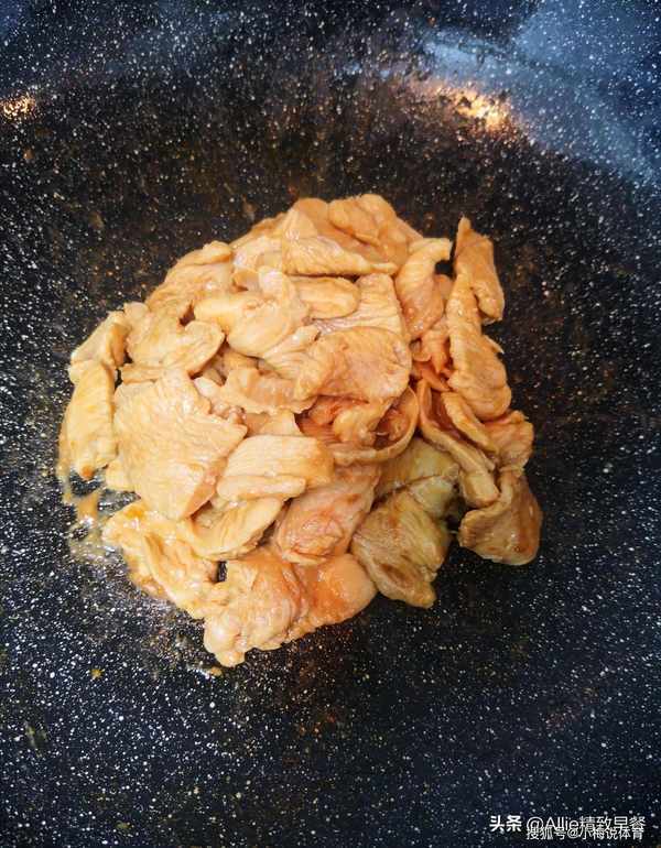 最后加入炸好的鸡肉拌匀,鸡肉在腌制的时候就已经调味了,这里就不用再加调料了。