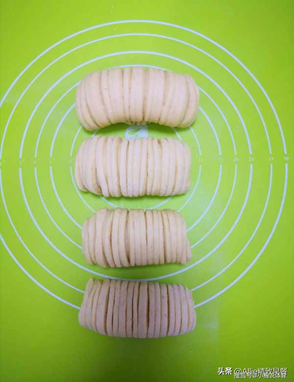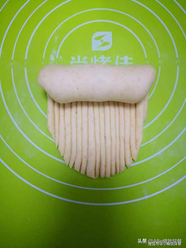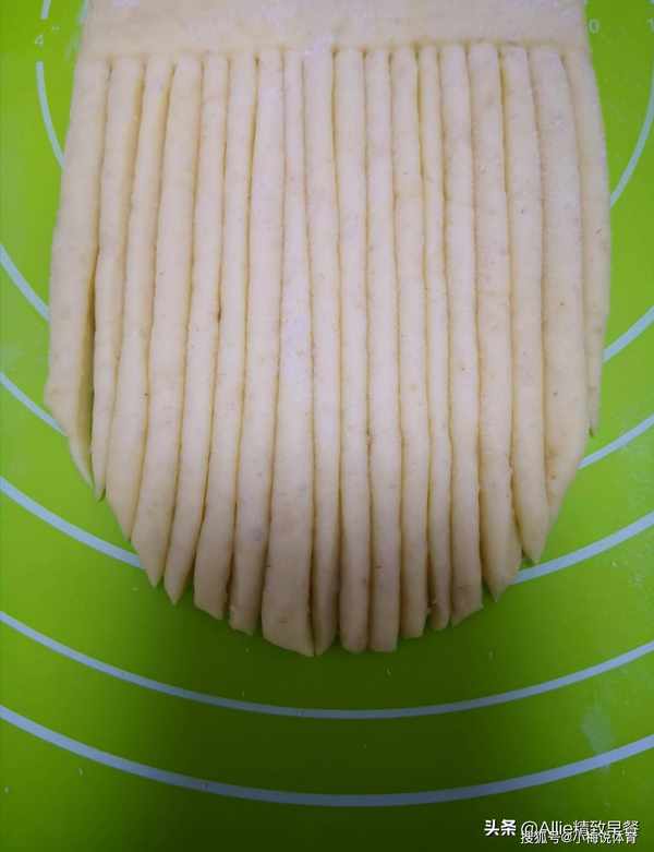 将每个部分平均分为三部分,然后将每个部分平均分为三部分。一共切成18等份,这样切出来的细条一样粗,更好看。切完后底部稍微压一下,避免细条回缩,面团比较硬,切细条的时候不容易粘,根部比较明显,这就是为什么我强调面团要硬一点第一的。