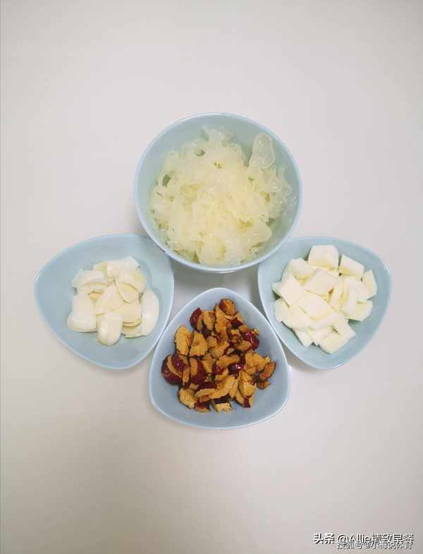 银耳泡发后洗净切丝,这次我用干百合泡发洗净,红枣去核切小块,红薯去皮切小块。.