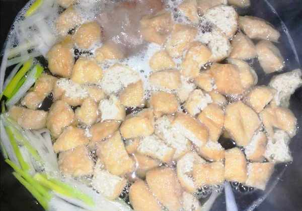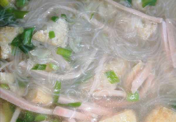 配料煮开后,放入切好的豆泡和火腿丝,再次煮开,放入生抽、蚝油、鸡精和食盐,搅拌均匀。