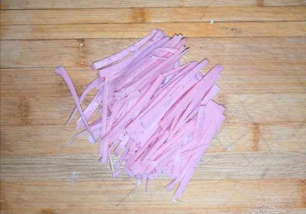 将火腿先切成片状,然后切成细丝。