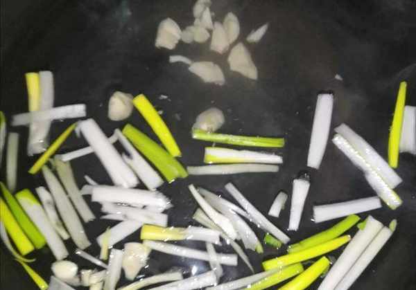 锅中倒入清水,放入切好的葱丝和蒜,煮至沸腾。