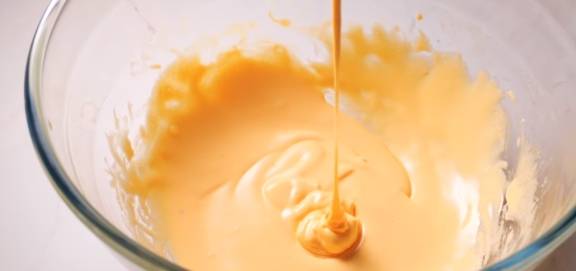 把蛋白霜分次加进蛋黄糊中,用切拌或者是翻拌的方式拌均匀,不可以画圈搅拌!