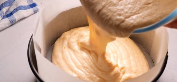 模具选择的是8寸的圆模,提前垫好油纸,倒入蛋糕糊。