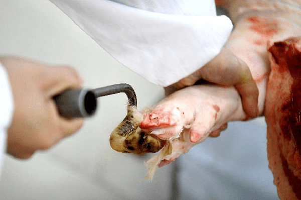 然后我们要再闻一下猪蹄的气味,正常的猪蹄会散发出一种肉腥味,不会闻到一点药水味。而浸泡过药水的猪蹄,能闻出淡淡的药水味,有时还会遮盖住猪蹄本身的肉腥味。