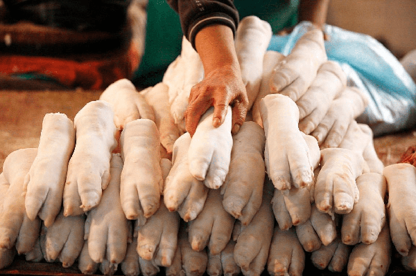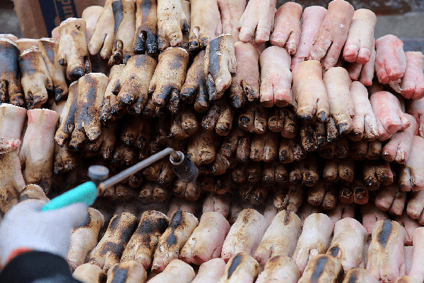 那些白白胖胖的,又白又嫩,表面很干净的“完美”猪蹄真的好吗?如果你真觉得这种是来自白胖的大肥猪,那你就真上了黑心商贩的当。这帮人为了谋取更大的利润,利用人们喜欢高颜值猪蹄这一弱点,把猪蹄放进化学药水中,一宿的功夫,再差的猪蹄也会变得白胖诱人。这种药水的成分主要有双氧水、火碱、亚硝酸钠等,双氧水可以给猪蹄“美白”,火碱使猪蹄变得肥大,而亚硝酸钠会使猪蹄看起来很新鲜。而这些成分都是不能入口的,是有毒的,对人体健康非常不利。