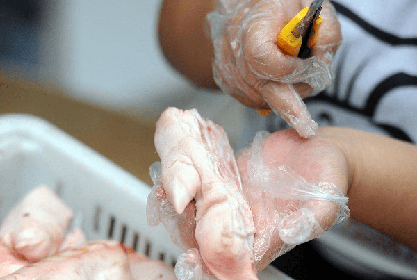 最后,再摸一下猪蹄的表面。如果猪蹄摸起来滑滑的,有点像洗衣粉的手感,大多是泡过化学药剂的。正常的猪蹄都是油腻腻的,不会有上述的手感。再用手在猪蹄上轻按一下,正常的猪蹄按起来较为松软,而浸泡过药水的猪蹄手感较硬,用刀轻轻一划,就会破裂。