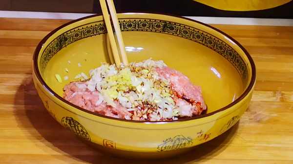 3、一块猪肘肉剁成肉馅,然后加入一勺盐、一勺生抽、一勺蚝油、适量的胡椒粉和葱、姜末,搅拌均匀后腌制10分钟,给肉馅入味和去腥。
