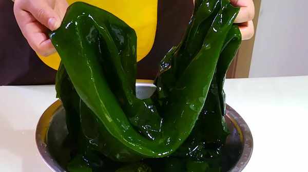 1、买回家的鲜海带剪成小块,然后放到淘米水中浸泡,目的是去除海带上的杂质,用淘米水清洗海带可以洗得更干净彻底。
